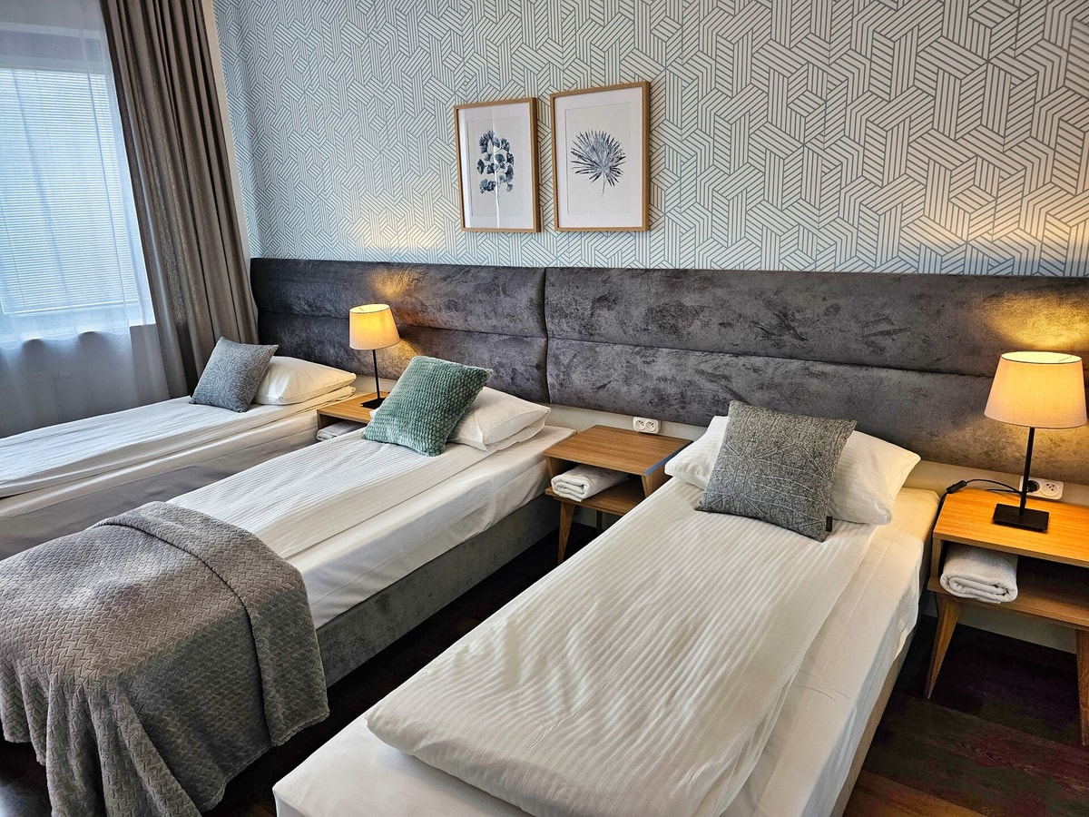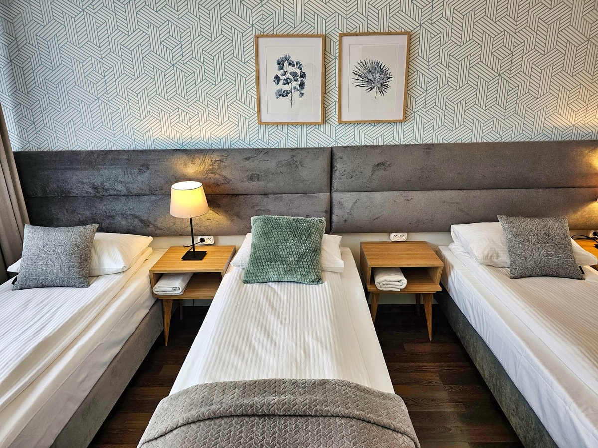 The apartment consists of a large living room with two beds and a sleeping sofa with balcony, separate kitchen, separate two bedrooms, bathroom, toilet