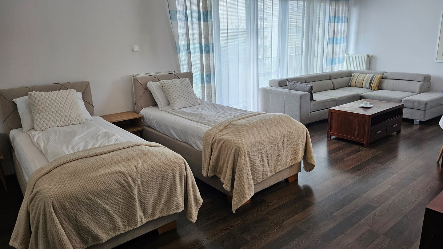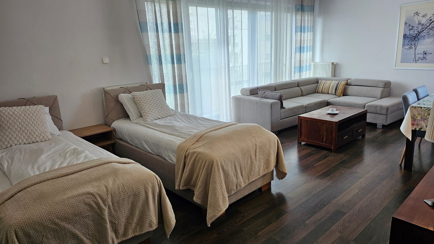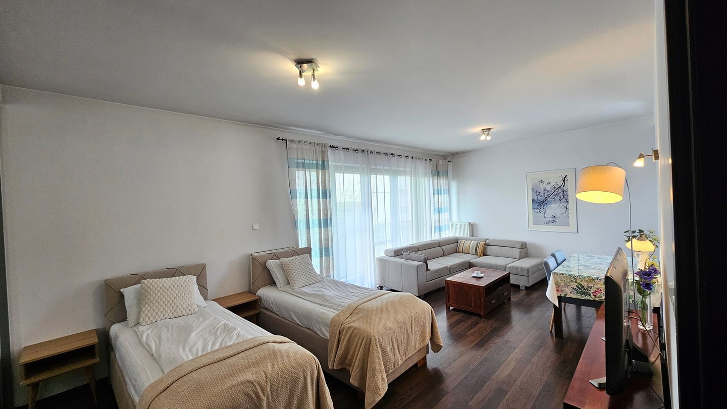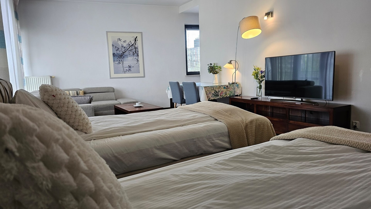 Comfortable studio, furnished in a modern style designed for 1-4 people. The apartment was chosen by us due to its very good location. Just around the corner there is the Dw Gdański metro station (2 stops to the Centrum station), trams, buses, and for the active Veturilo bicycle station. You can walk to the Old Town or the Polin Museum. There are numerous restaurants, cafes and shops on the site. Apartment is for people who are not only looking for a good location, but also for comfort, quiet and rest after an active day. Although the apartment is in the city center, it provides the perfect silence. In addition, the apartment you will love for a comfortable bed. We issue invoices, the possibility of ordering breakfasts. The flat is located on the 4th floor in a building with an elevator. It is fully equipped, ready for short and long stays. Perfect for business trips and tourists looking for a base to explore Warsaw. From here it is close to everywhere. Space: The studio consists of a room with a seating area with a balcony and a sleeping area and a kitchenette, a bathroom. Room: In the seating area there is a comfortable 2 seater sofa with sleeping function, a coffee table, TV with sound bar sound system. Sleeping area: There is a double bed in it that ensures sleep comfort and regeneration for the next day, bedside table, TV. Kitchen annex: The kitchen is fully equipped. It contains all the necessary things to prepare and serve meals. Bathroom: We can find a toilet, a shower and a washbasin in it. For guests there is a hair dryer, shampoo and shower gel, a set of towels, a washing machine. Neighborhood: There are several restaurants, cafes, a pharmacy, 2 supermarkets: Piotr i Paweł and Simply (in the ATM), Rossmann. There is really everything you need for a shorter stay. This is my one of the most favorite locations. On foot: Polin Museum 10 min Old Town, New Town 10 min Arkadia Shopping Center 10 min Krasinski Garden (Park) 5 min Muranów Cinema 4 min (one metro stop or two tram stops) Movement: Metro and railway station 4-5 min walking from the apartment (Dw Gdanski station): 3 stops to Centrum station (10min) 2-3 minutes on foot to bus and tram stops. You will get here from anywhere in Warsaw. There is a Veturilo bicycle station by the metro station Direct access to the Old Town with lines 116 and 178, 503 (journey time is 13-19 minutes, but the same time will take a walk) You can start the sightseeing of the Old Town from the New Town How to reach the apartment: The most comfortable place get to the Dw Gdański metro station, from where it is only 5 minutes to the apartment. The car entrance to the estate is from Stawki Street (from Rossman) Only people who bought a car park can enter the estate but you can also park around the building. Taxi: From Chopin Airport (Okęcie Airport): 39-51 PLN (travel time: 26-35 minutes), PLN 22-30 PLN from PKP Central Train Station: PLN 18-23 (journey time: 13-15 minutes), uber 11- 14 pln Guest access: Guests have access to all the equipment in the apartment, make yourself at home, coffee, black / green tea, Brita filtered water, cosmetics kit and towels. a washing machine, a clothes dryer, a hair dryer, An iron and an ironing board are located in the built-in wardrobe. The kitchen is fully equipped to prepare meals as much as at home. There is a playground for children in the estate. Parking space in the underground garage is additionally payable 30 PLN / day. Other important information: The apartment is completely non-smoking. The property does not accept pets. For breaking the above regulations, a fee of 550 PLN will be charged for the event. In the apartment is not allowed to organize events, social events and conduct any form of business. The apartment can accommodate no more than the number of people specified in the booking. For breaking the above regulations will be charged a fee of 1500 PLN. This also applies to the arrival of the police / municipal guard. The apartment is only for accommodation purposes. Please observe the quiet hours from 22:00 to 6:00. Check-in after 21:30 incurs an additional fee of 35 PLN. Check-out is at 11:00. If you do not inform about the desire to check out later, you will be charged a fee of 25 PLN for each started hour, so we encourage guests to contact us to avoid payment :) Size: 38 m2. Amenities: Bed Linen Towels, Terrace, heating, Wheelchair access possible, On street parking, Free Wireless Internet, Elevator, Paid parking with garage; Bathroom: Drying Rack, Hair Dryer, Toiletries, Washing Machine, toilet, chest of drawers, shower, Towels, mirror; Bedroom: Bed Linen Towels, Cable TV, double bed, night table, reading lamps; Livingroom / Bedroom: Cable TV, night tables, reading lamps, Balcony, armchairs, coffee table, lamp, double sofa bed, Bed Linen;